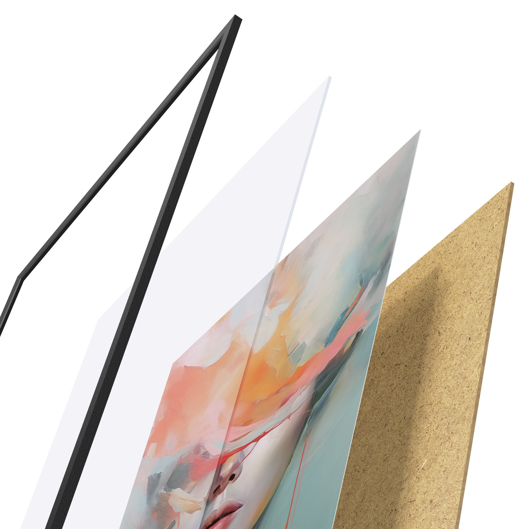 Plakat składa się z ramy, pleksi, wydrukowanego obrazu i podkładu z płyty wiórowej. Plakat można natychmiast zawiesić na ścianie dzięki uchwytom z tyłu.