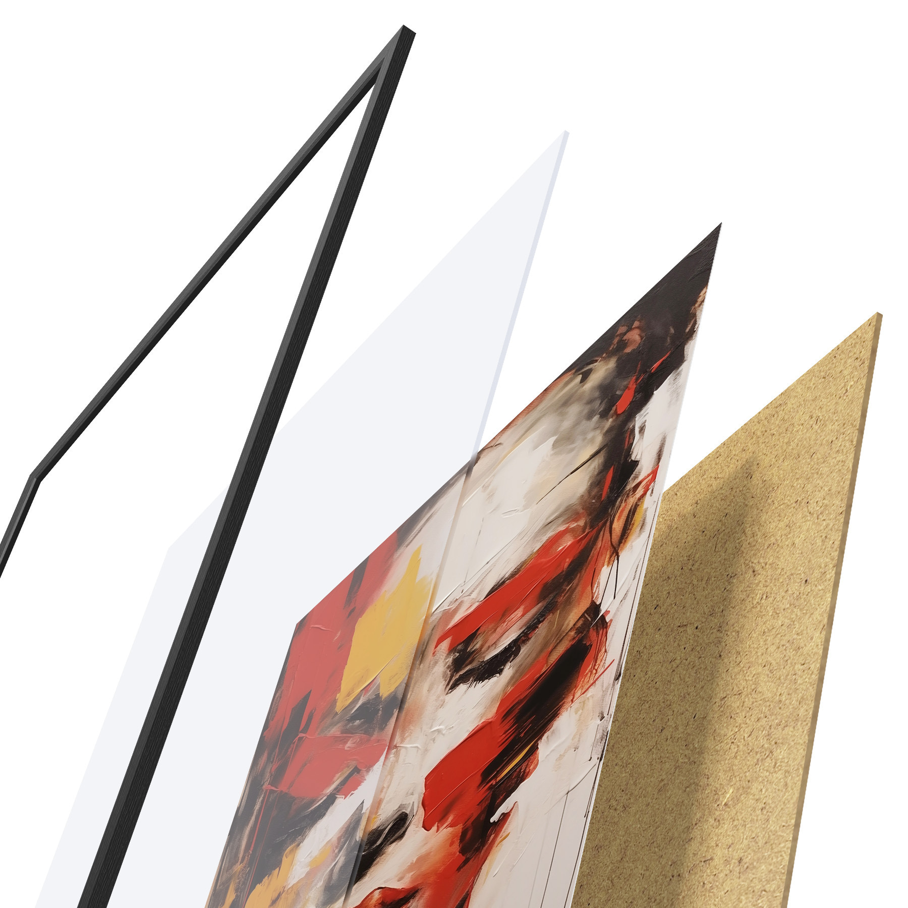 Plakat składa się z ramy, pleksi, wydrukowanego obrazu i podkładu z płyty wiórowej. Plakat można natychmiast zawiesić na ścianie dzięki uchwytom z tyłu.
