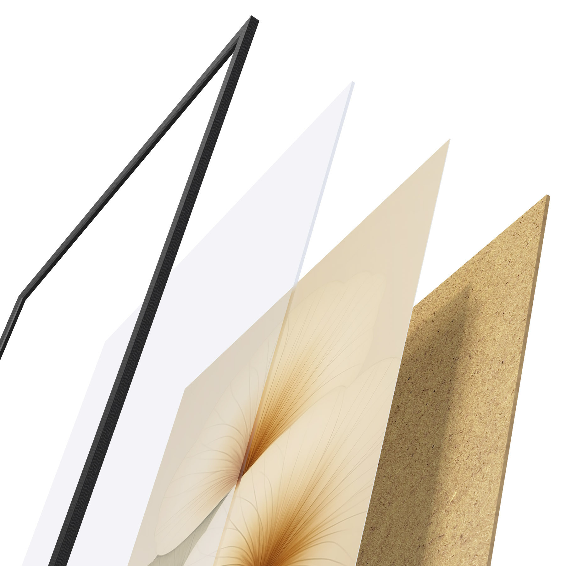 Plakat składa się z ramy, pleksi, wydrukowanego obrazu i podkładu z płyty wiórowej. Plakat można natychmiast zawiesić na ścianie dzięki uchwytom z tyłu.