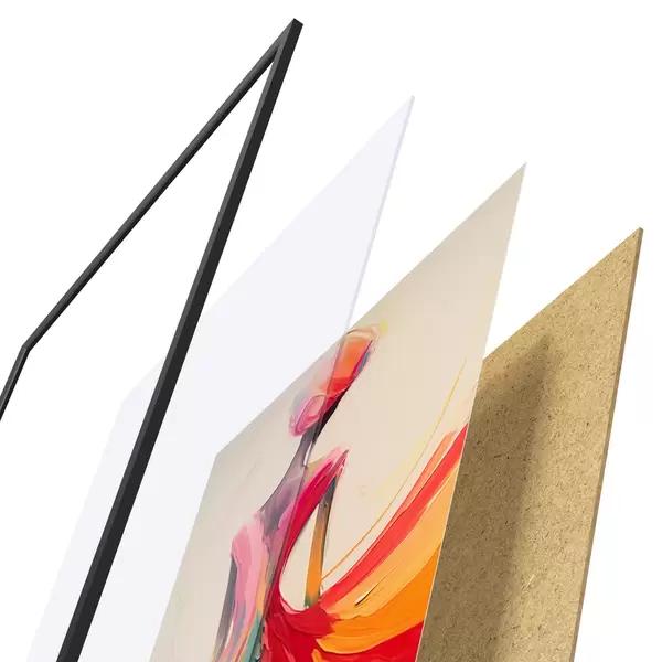 Plakat składa się z ramy, pleksi, wydrukowanego obrazu i podkładu z płyty wiórowej. Plakat można natychmiast zawiesić na ścianie dzięki uchwytom z tyłu.