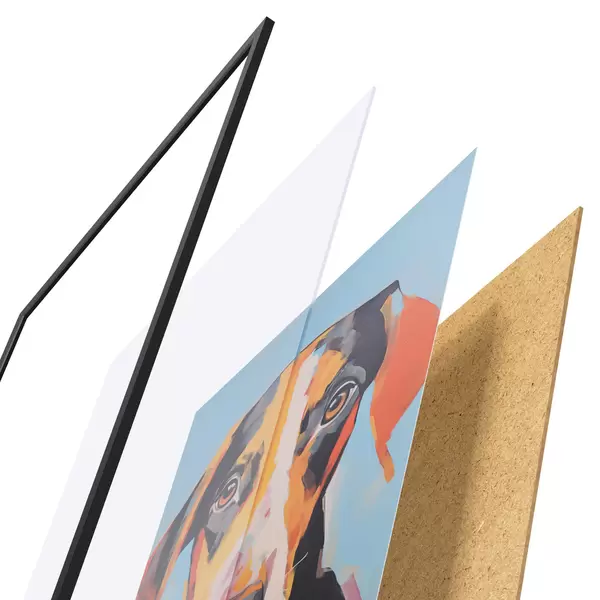 Plakat składa się z ramy, pleksi, wydrukowanego obrazu i podkładu z płyty wiórowej. Plakat można natychmiast zawiesić na ścianie dzięki uchwytom z tyłu.