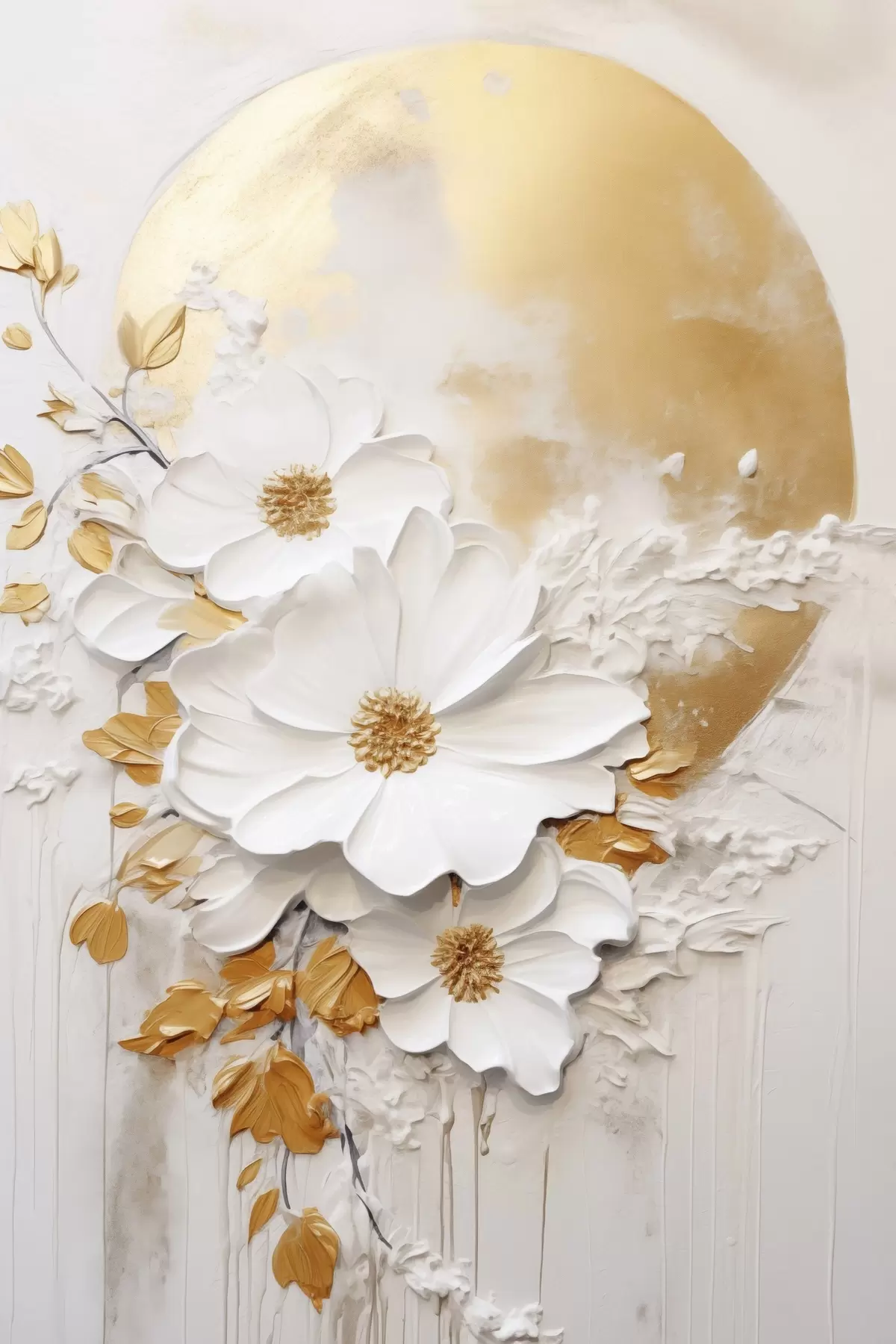 Poster Białe kwiaty z żółtymi akcentami i delikatnymi liśćmi na teksturowanym tle, sztuka współczesna Nr f47414