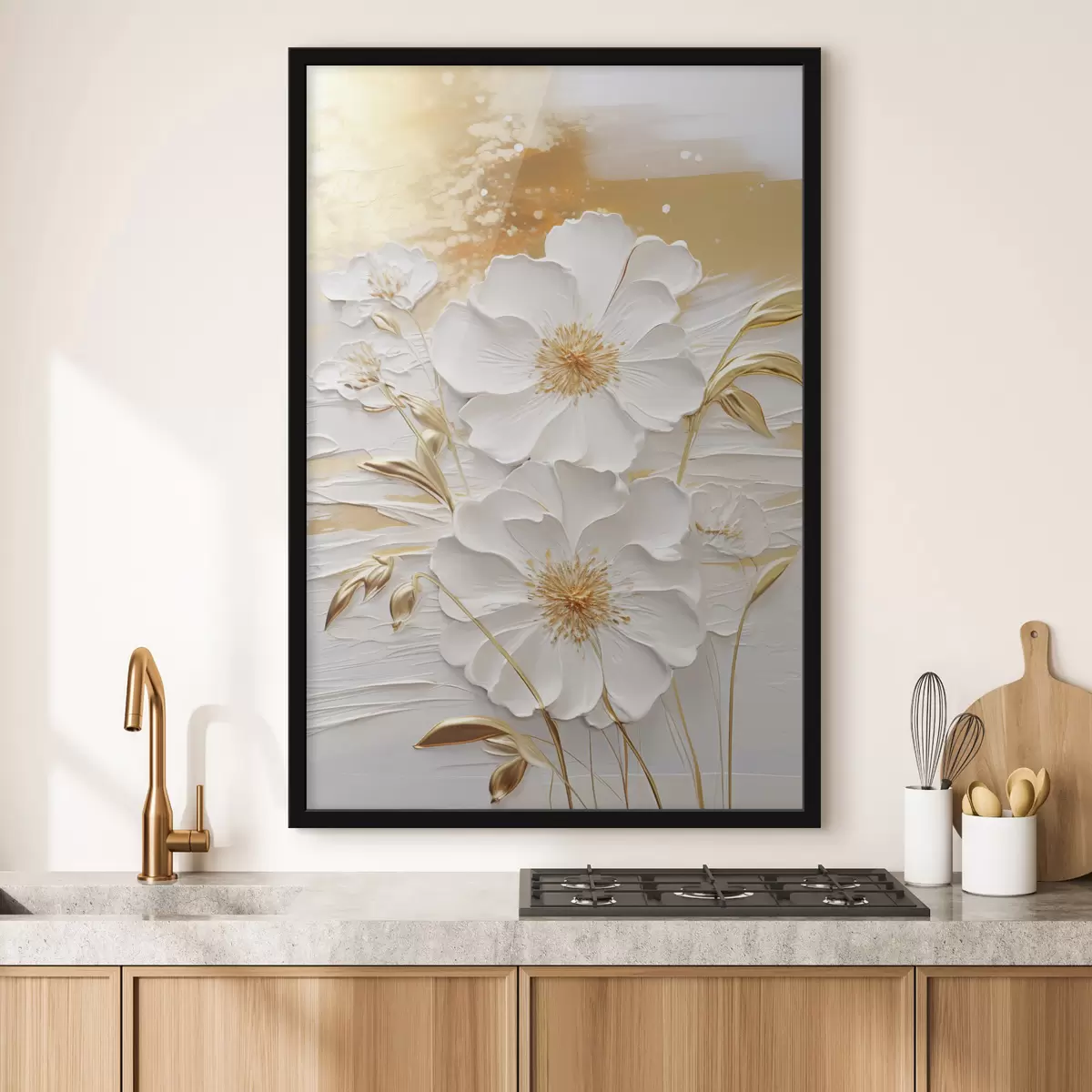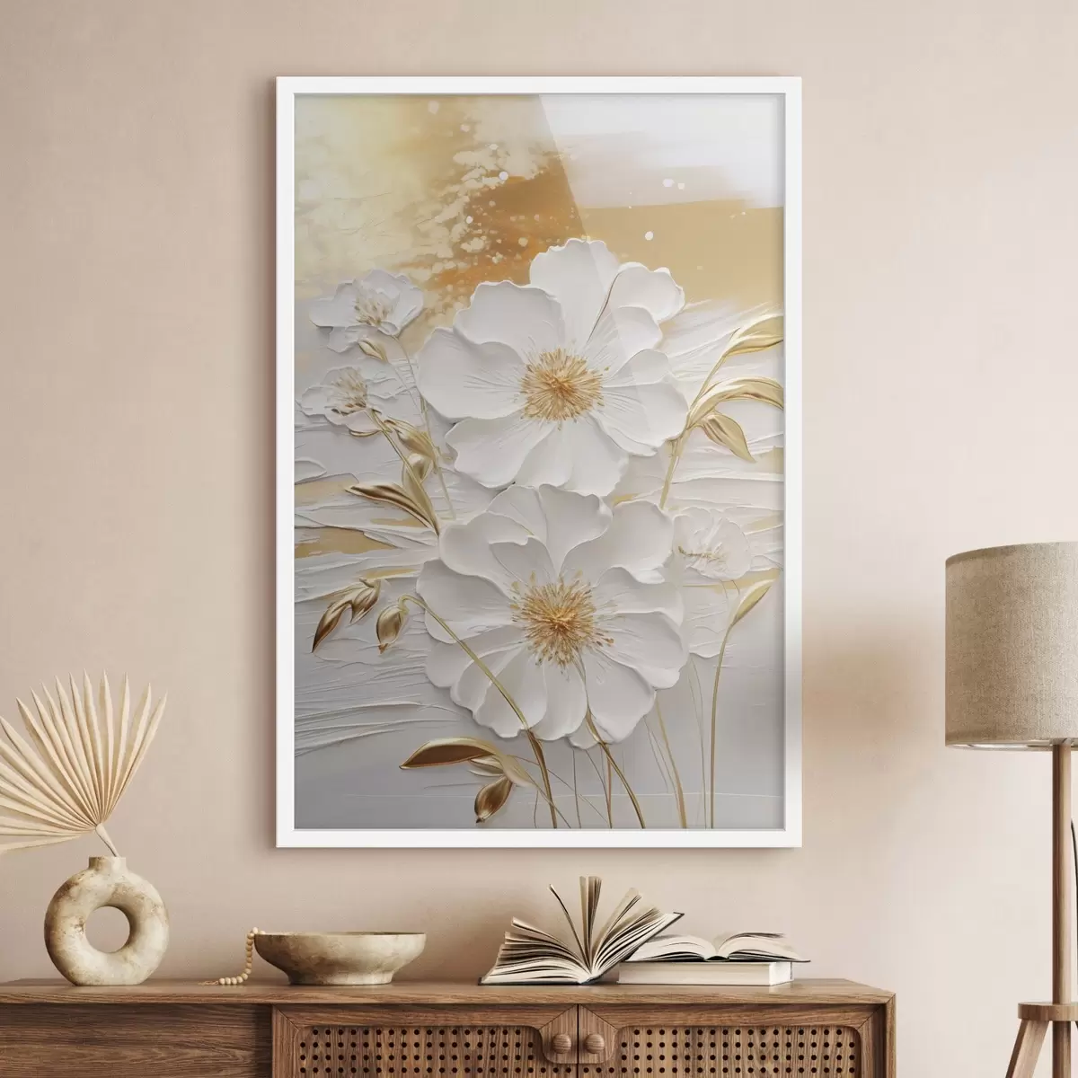 Plakat Białe kwiaty z żółtymi akcentami i delikatnymi liśćmi na teksturowanym tle, sztuka współczesna f47415