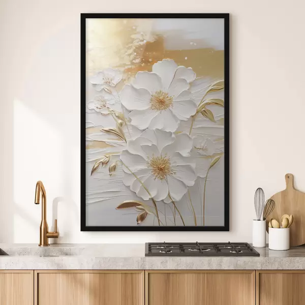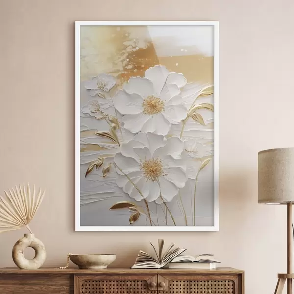 Poster Białe kwiaty z żółtymi akcentami i delikatnymi liśćmi na teksturowanym tle, sztuka współczesna Nr f47415