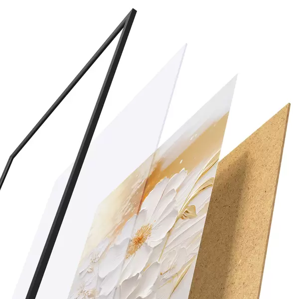 Plakat składa się z ramy, pleksi, wydrukowanego obrazu i podkładu z płyty wiórowej. Plakat można natychmiast zawiesić na ścianie dzięki uchwytom z tyłu.