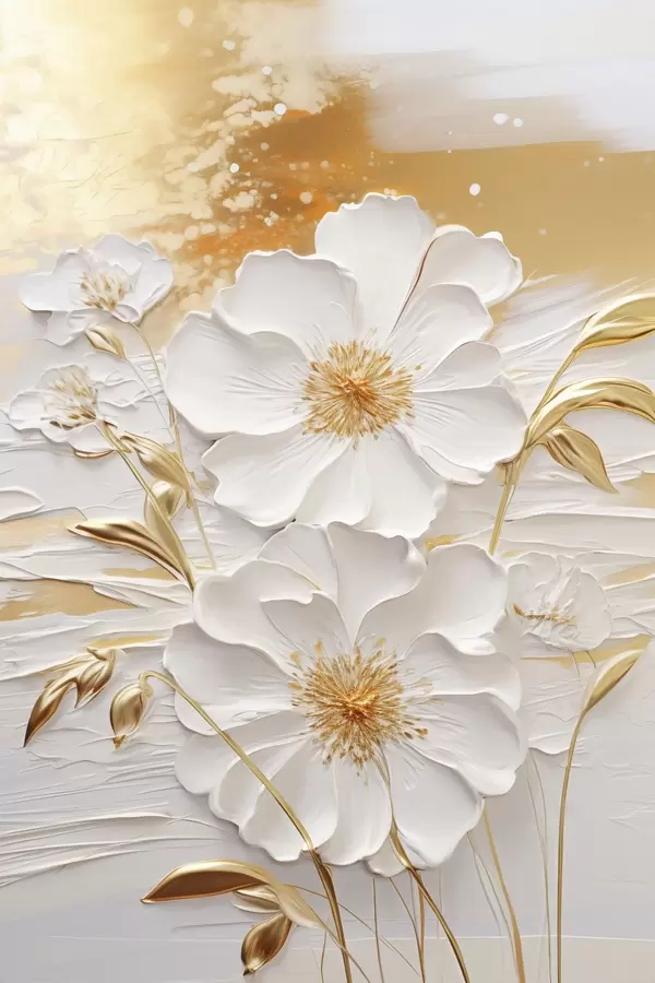 Poster Białe kwiaty z żółtymi akcentami i delikatnymi liśćmi na teksturowanym tle, sztuka współczesna Nr f47415