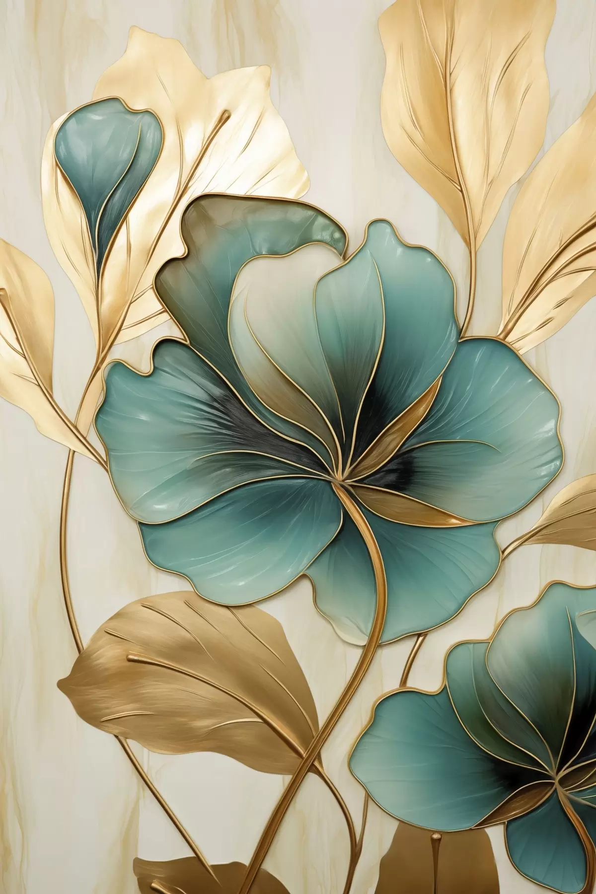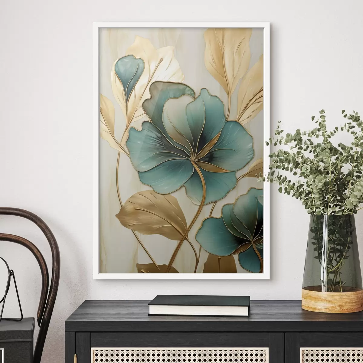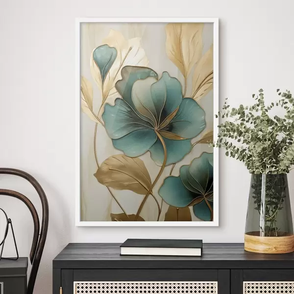 Plakat Duże turkusowo-żółte kwiaty z konturami, otoczone żółtymi liśćmi na abstrakcyjnym tle f47419