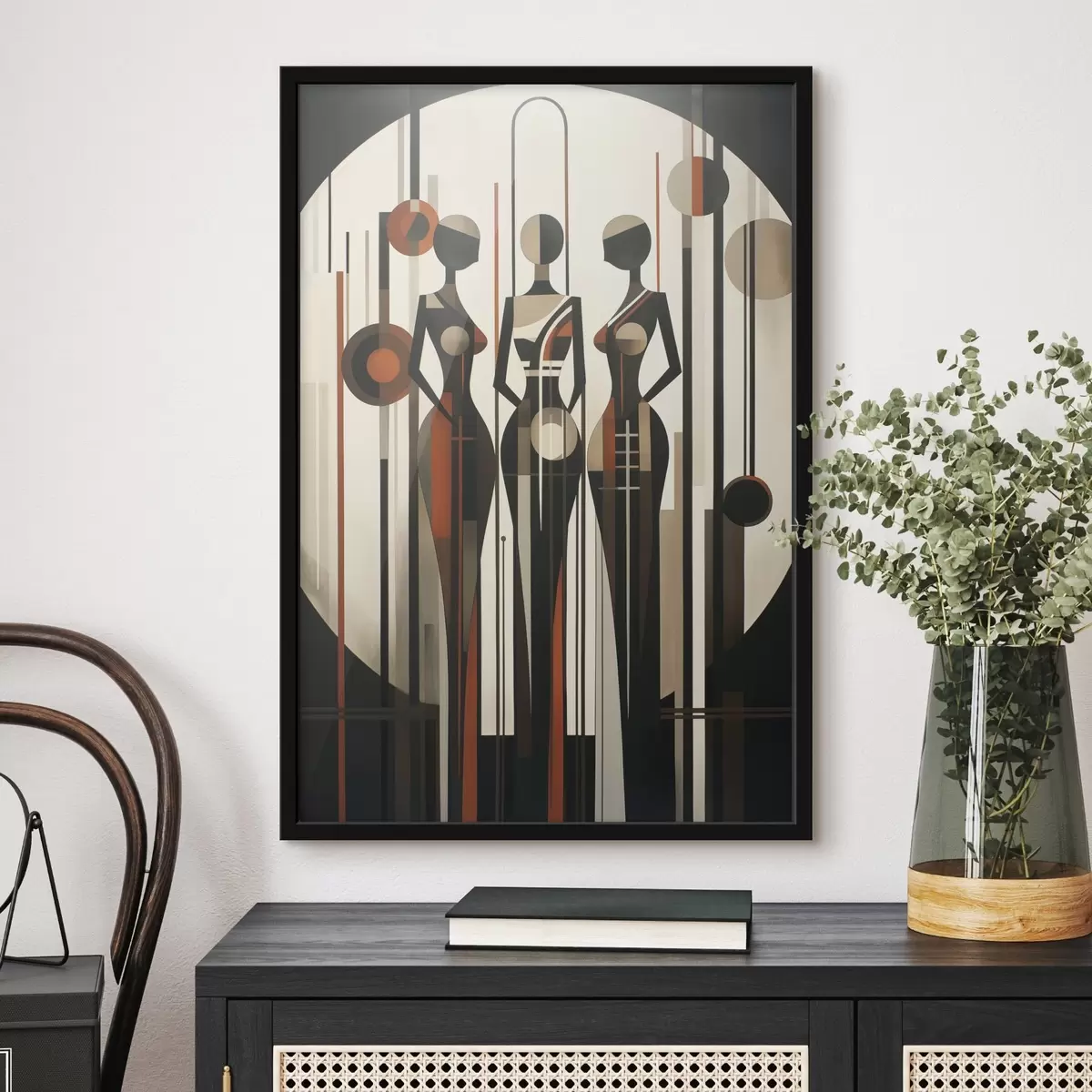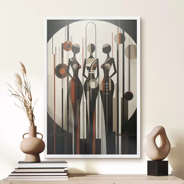 Plakat Stylizowane postacie kobiece z elementami geometrycznymi na abstrakcyjnym tle pionowych linii i okręgów f47422