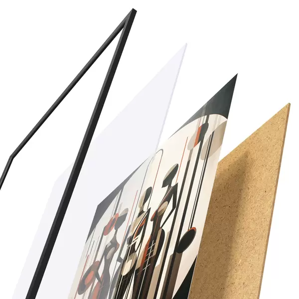 Plakat składa się z ramy, pleksi, wydrukowanego obrazu i podkładu z płyty wiórowej. Plakat można natychmiast zawiesić na ścianie dzięki uchwytom z tyłu.