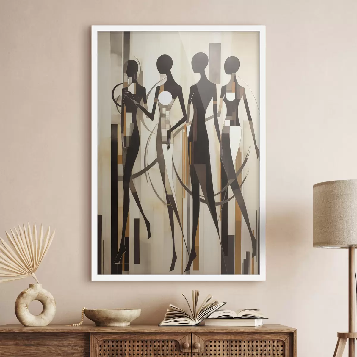Plakat Stylizowane postacie kobiece z elementami geometrycznymi na abstrakcyjnym tle pionowych linii f47423