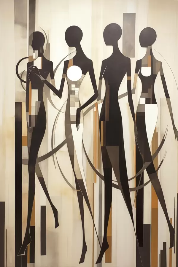 Plakat Stylizowane postacie kobiece z elementami geometrycznymi na abstrakcyjnym tle pionowych linii f47423