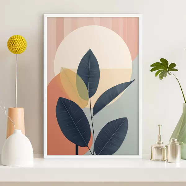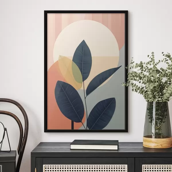 Poster Ciemne liście na tle abstrakcyjnych kształtów w kolorze brzoskwiniowym i szarym z dużym, jasnożółtym okręgiem Nr f47424