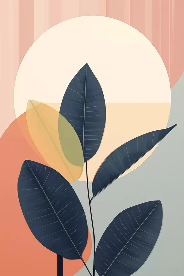 Poster Ciemne liście na tle abstrakcyjnych kształtów w kolorze brzoskwiniowym i szarym z dużym, jasnożółtym okręgiem Nr f47424