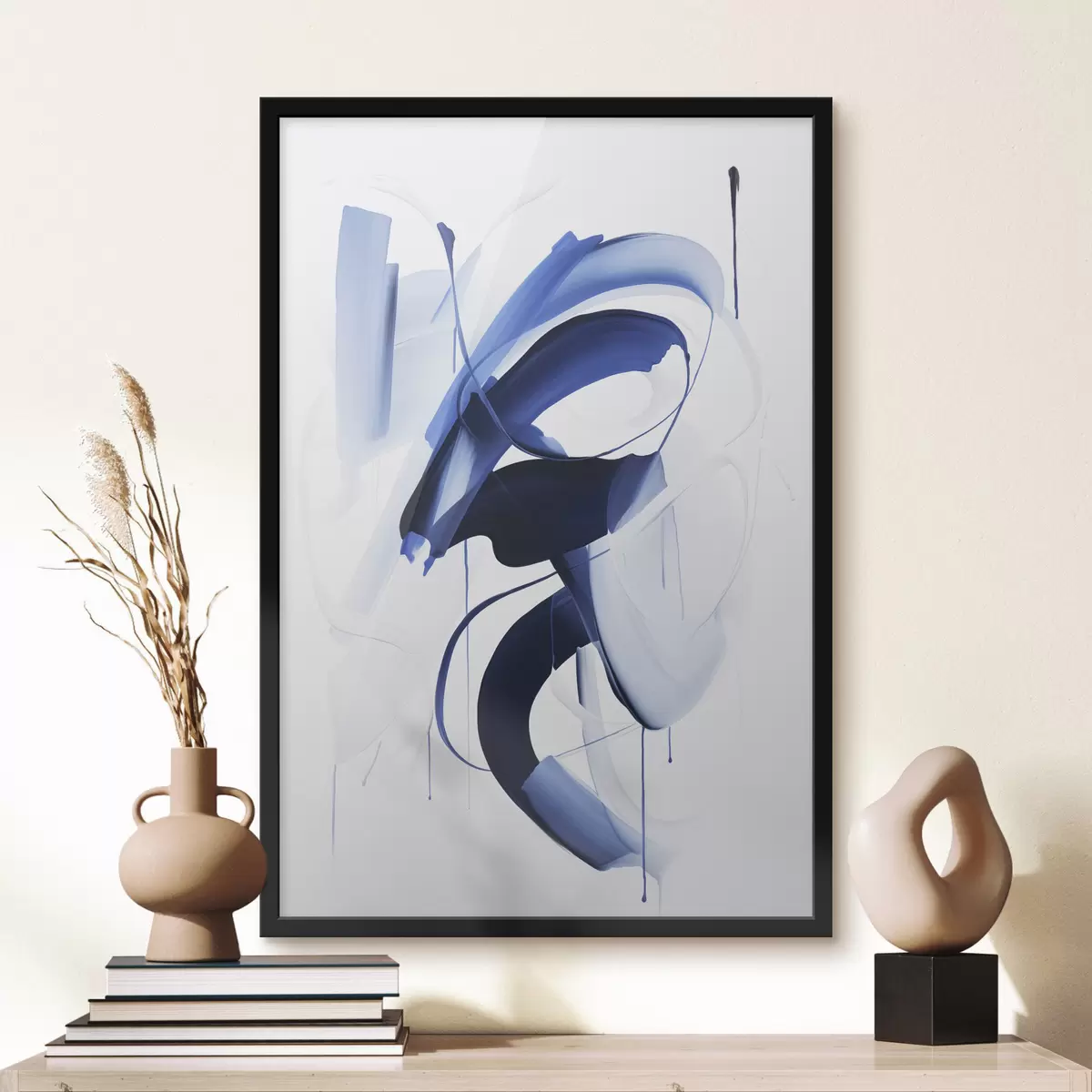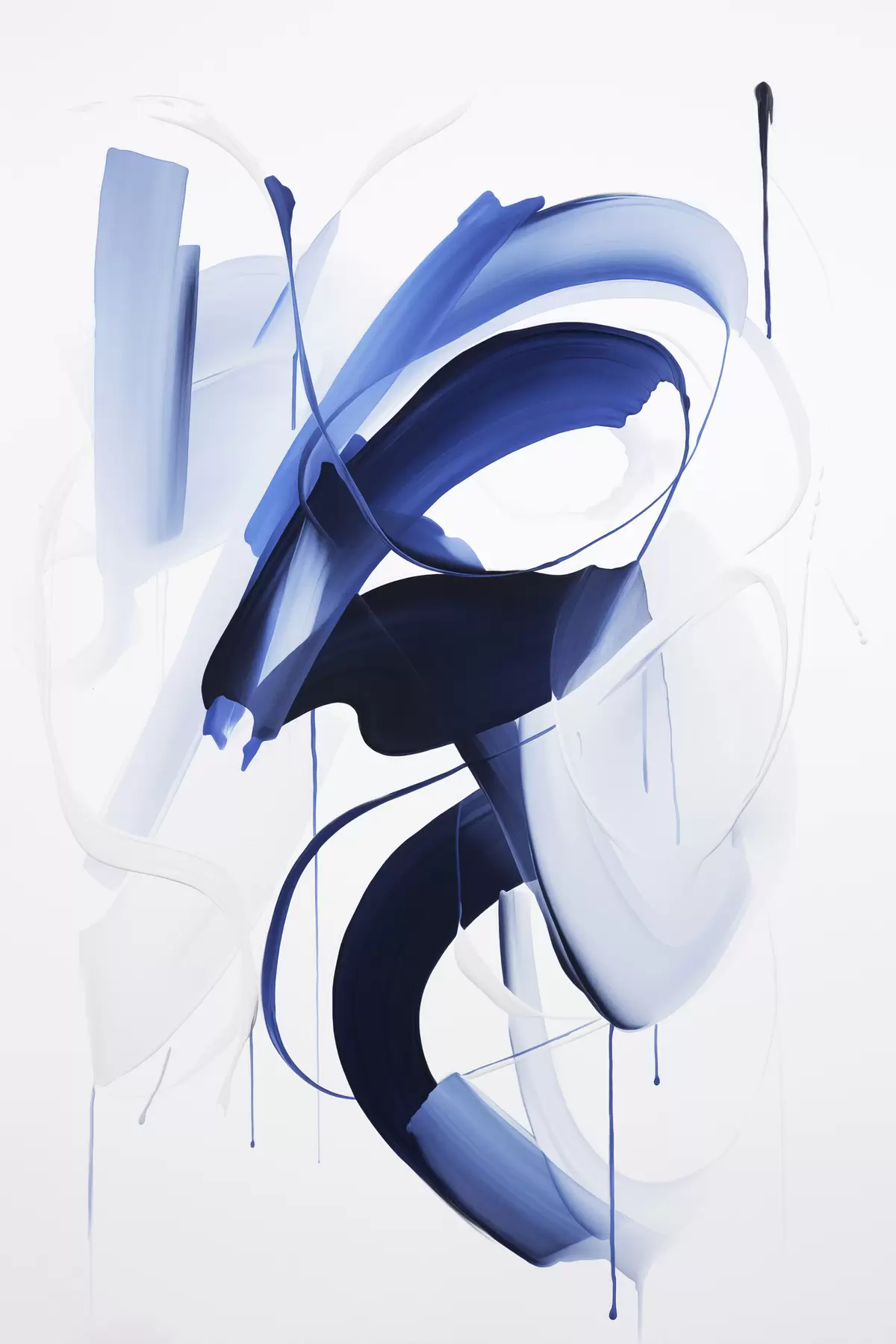 Plakat Abstrakcyjne niebieskie kształty przypominające pociągnięcia pędzla, z płynnymi liniami i krzywiznami na białym tle, sztuka nowoczesna f47428