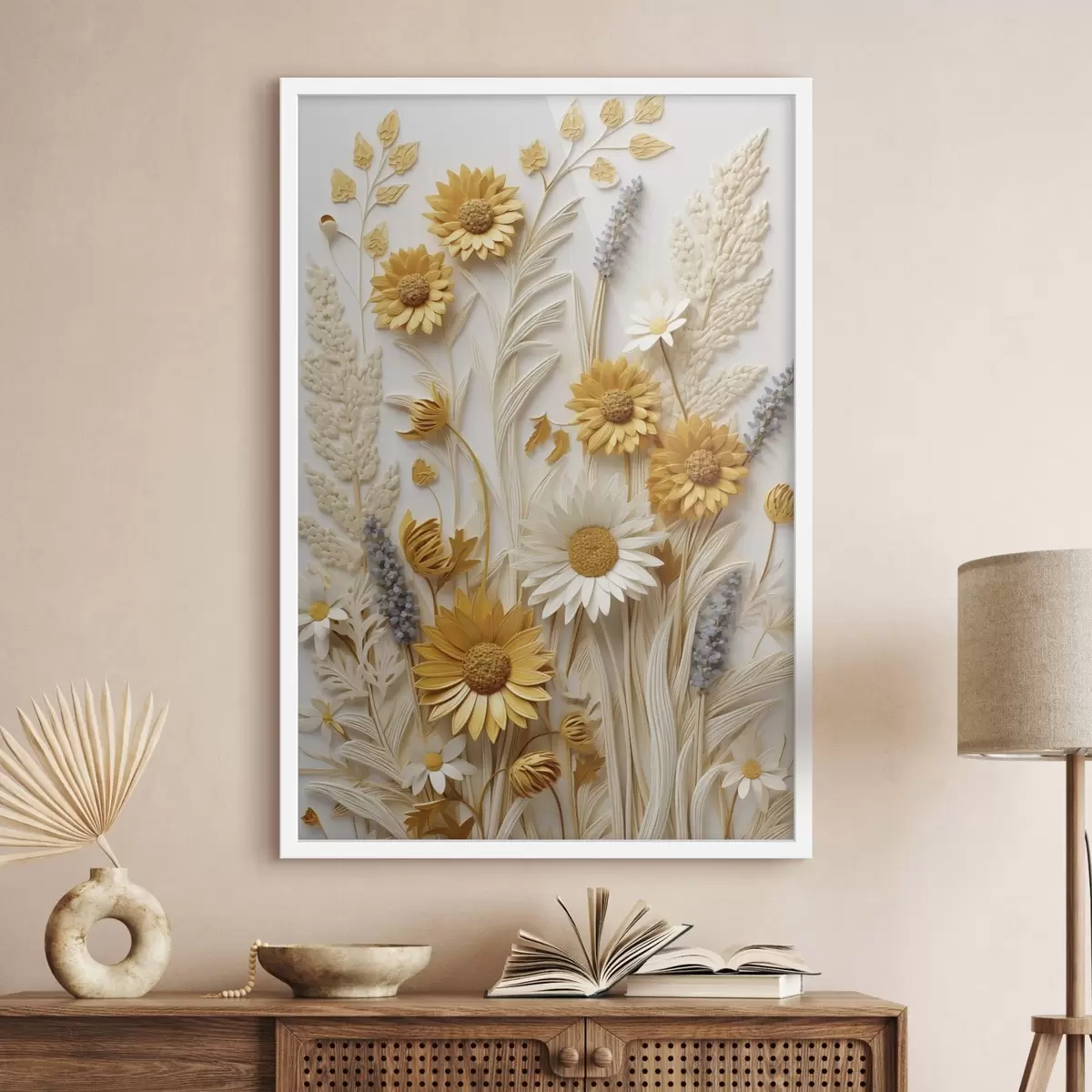 Plakat Teksturowana kolekcja żółtych i białych stokrotek z suszonymi trawami i gałązkami lawendy na białym tle. f47430
