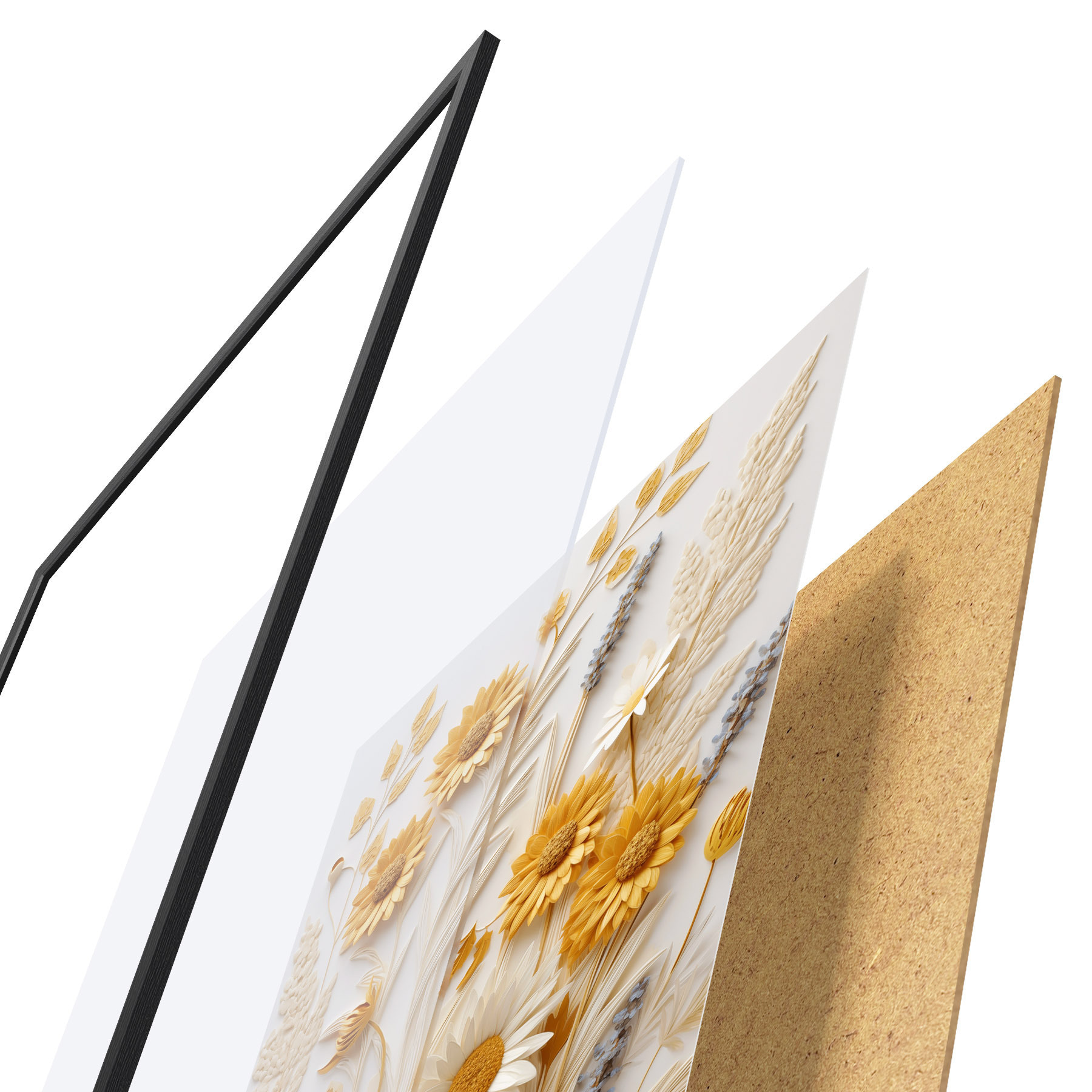 Plakat składa się z ramy, pleksi, wydrukowanego obrazu i podkładu z płyty wiórowej. Plakat można natychmiast zawiesić na ścianie dzięki uchwytom z tyłu.