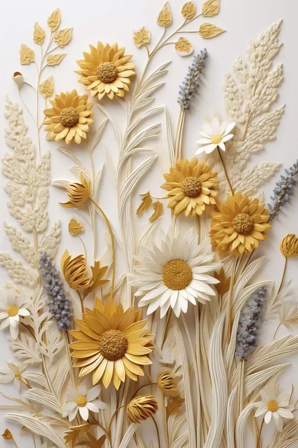 Plakat Teksturowana kolekcja żółtych i białych stokrotek z suszonymi trawami i gałązkami lawendy na białym tle. f47430