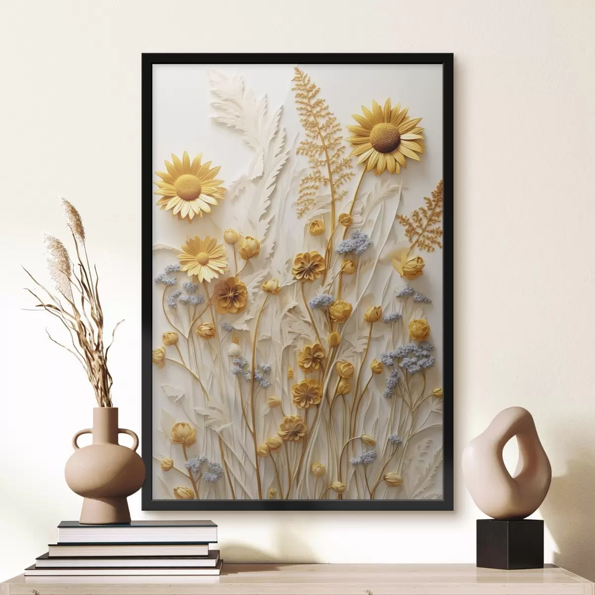 Plakat Teksturowana kolekcja żółtych i białych stokrotek z suszonymi trawami i gałązkami lawendy na białym tle. f47431