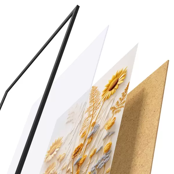 Plakat składa się z ramy, pleksi, wydrukowanego obrazu i podkładu z płyty wiórowej. Plakat można natychmiast zawiesić na ścianie dzięki uchwytom z tyłu.