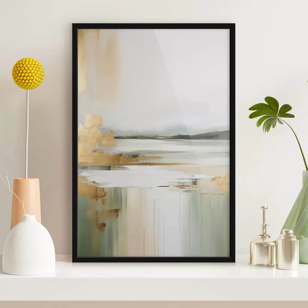 Poster Abstrakcyjny krajobraz w odcieniach żółci i zieleni, woda odbijająca niebo i odległe góry, blade, zamglone niebo. Nr f47438