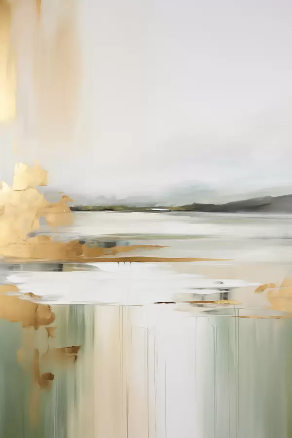 Poster Abstrakcyjny krajobraz w odcieniach żółci i zieleni, woda odbijająca niebo i odległe góry, blade, zamglone niebo. Nr f47438