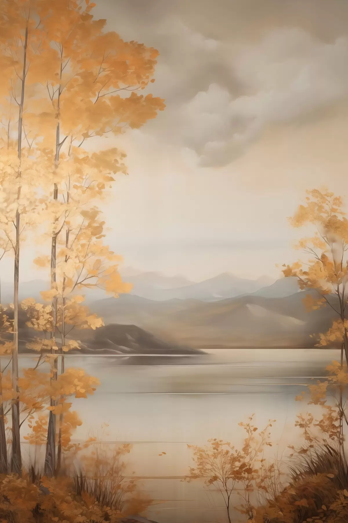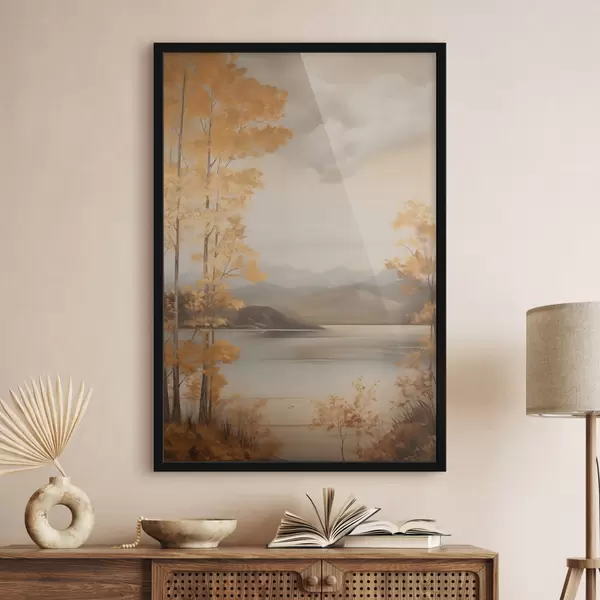 Plakat Jesienne drzewa o pomarańczowych liściach otaczają spokojne jezioro z odległymi górami pod zachmurzonym niebem. f47441
