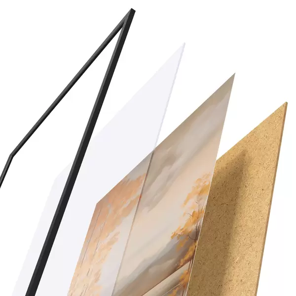 Plakat składa się z ramy, pleksi, wydrukowanego obrazu i podkładu z płyty wiórowej. Plakat można natychmiast zawiesić na ścianie dzięki uchwytom z tyłu.