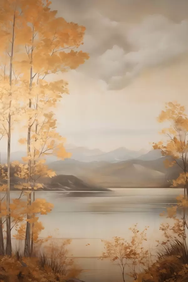 Poster Jesienne drzewa o pomarańczowych liściach otaczają spokojne jezioro z odległymi górami pod zachmurzonym niebem. Nr f47441