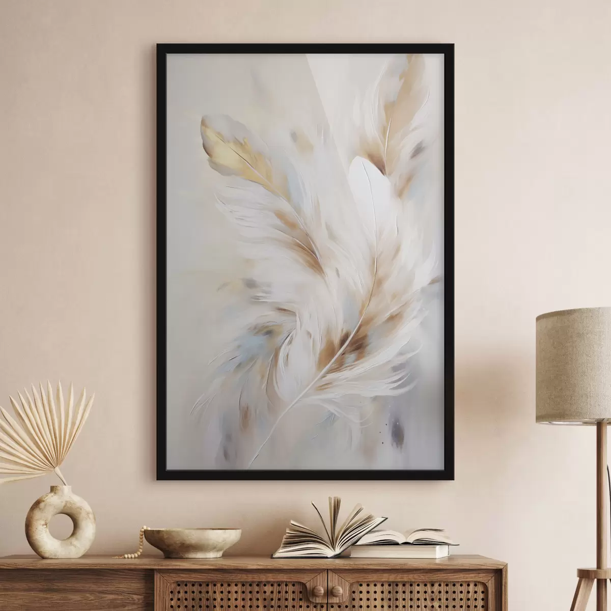 Plakat Duże, miękkie pióra w odcieniach bieli, żółci i brązu na jasnym, abstrakcyjnym tle. f47442