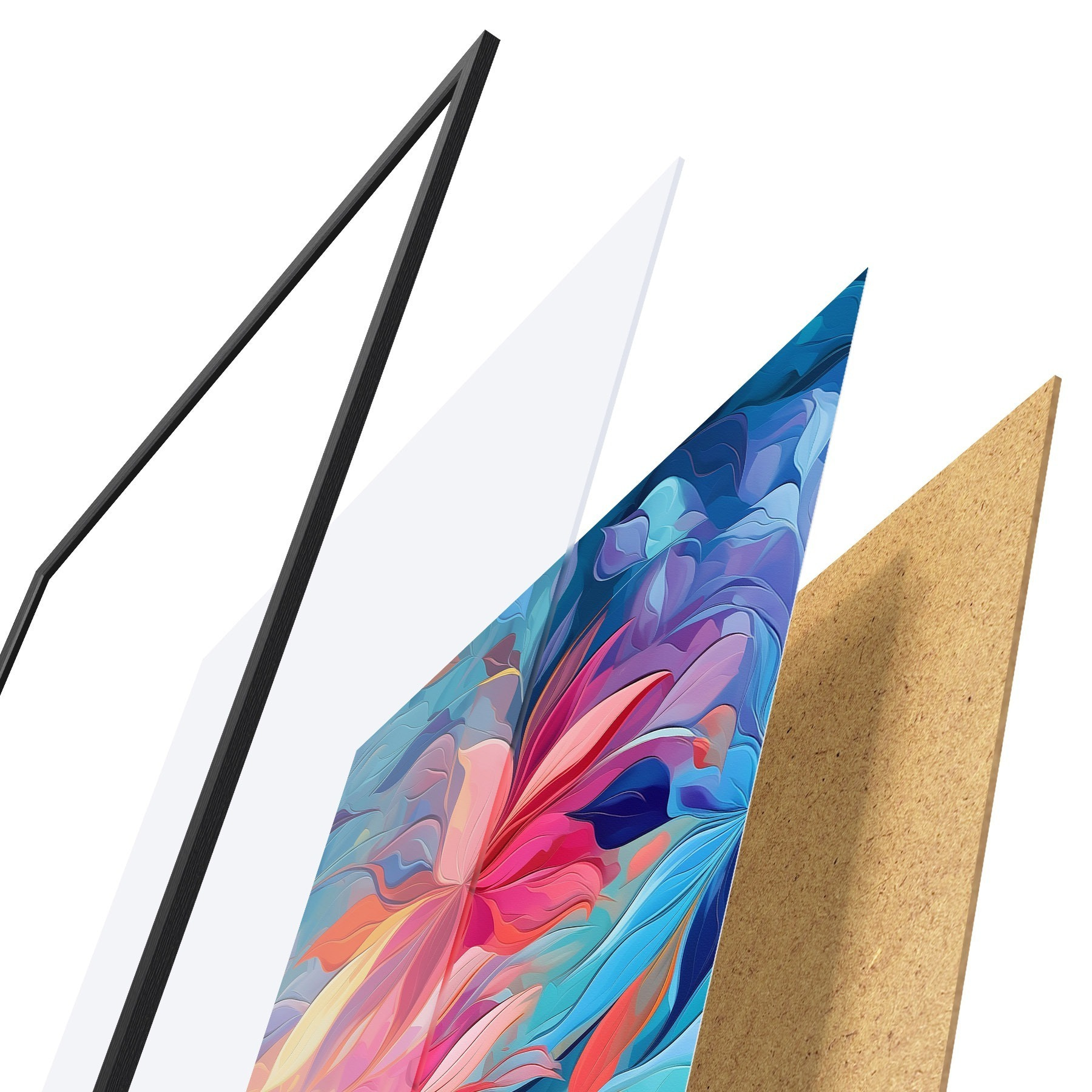 Plakat składa się z ramy, pleksi, wydrukowanego obrazu i podkładu z płyty wiórowej. Plakat można natychmiast zawiesić na ścianie dzięki uchwytom z tyłu.