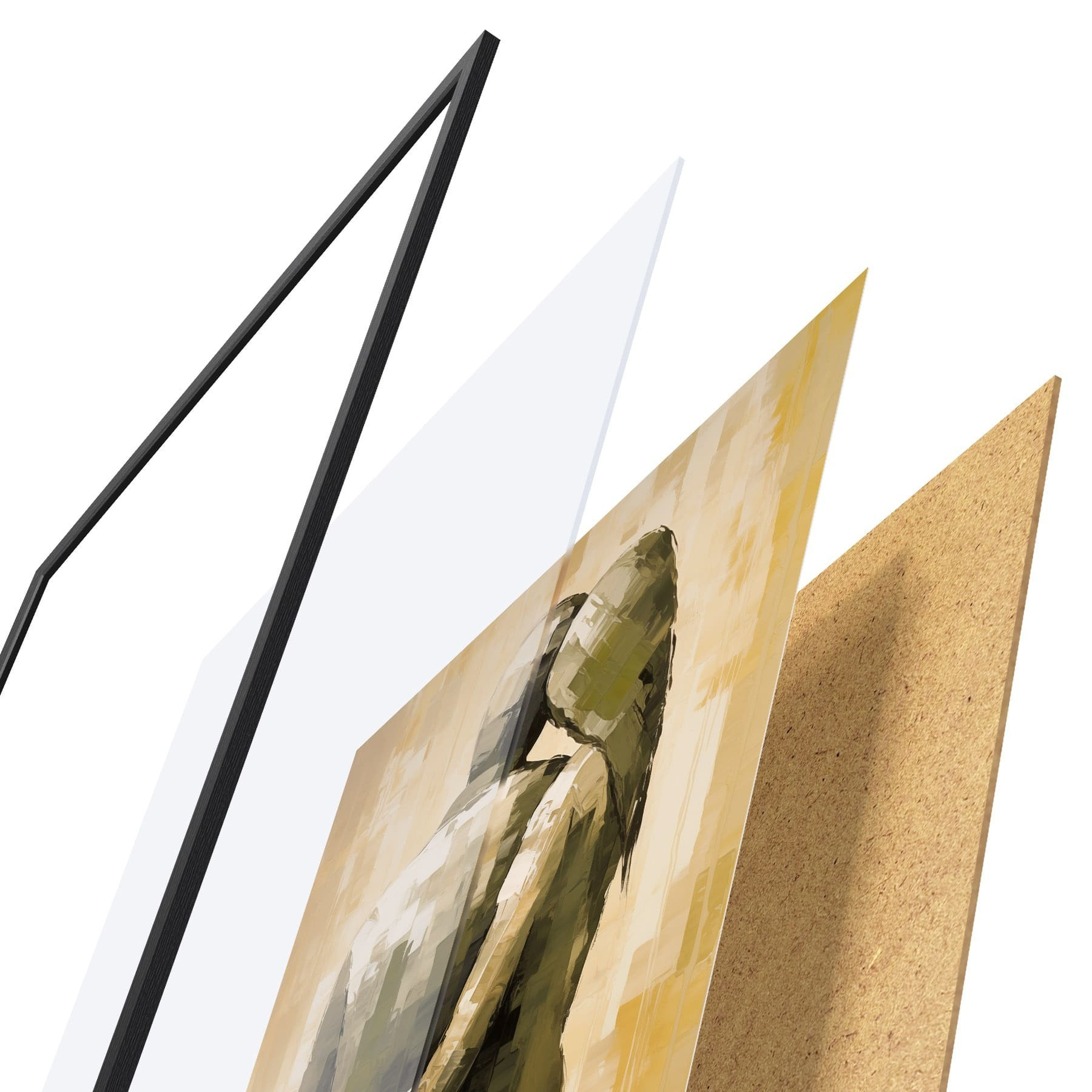 Plakat składa się z ramy, pleksi, wydrukowanego obrazu i podkładu z płyty wiórowej. Plakat można natychmiast zawiesić na ścianie dzięki uchwytom z tyłu.