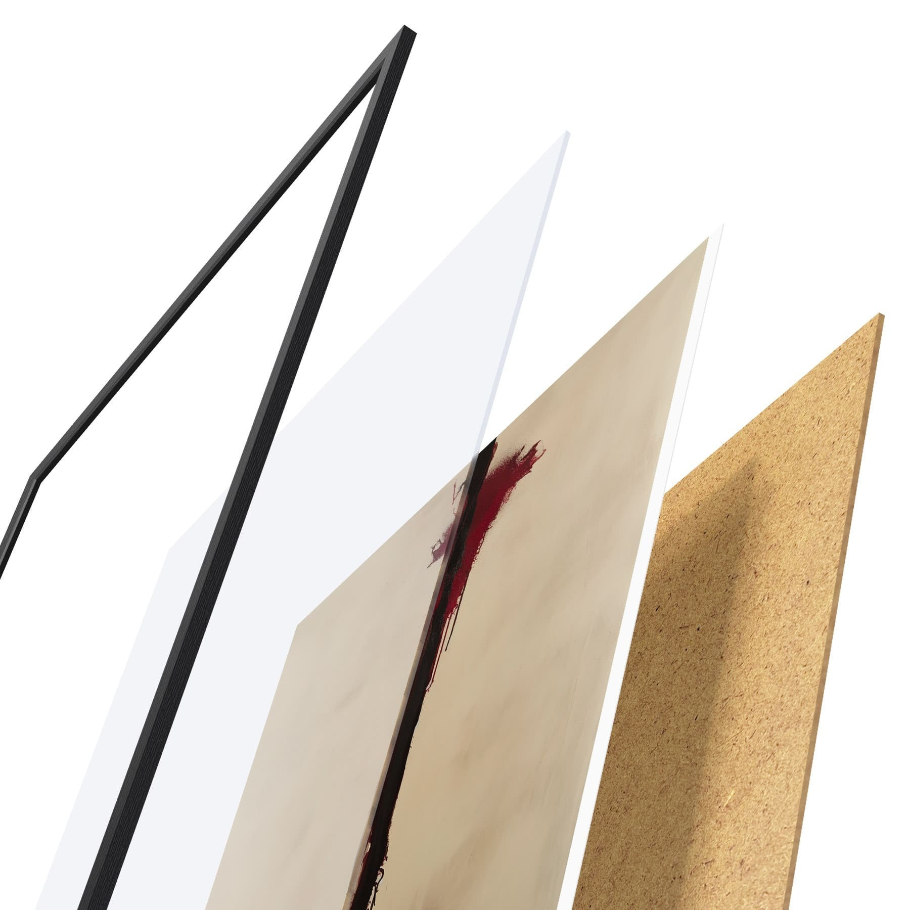 Plakat składa się z ramy, pleksi, wydrukowanego obrazu i podkładu z płyty wiórowej. Plakat można natychmiast zawiesić na ścianie dzięki uchwytom z tyłu.