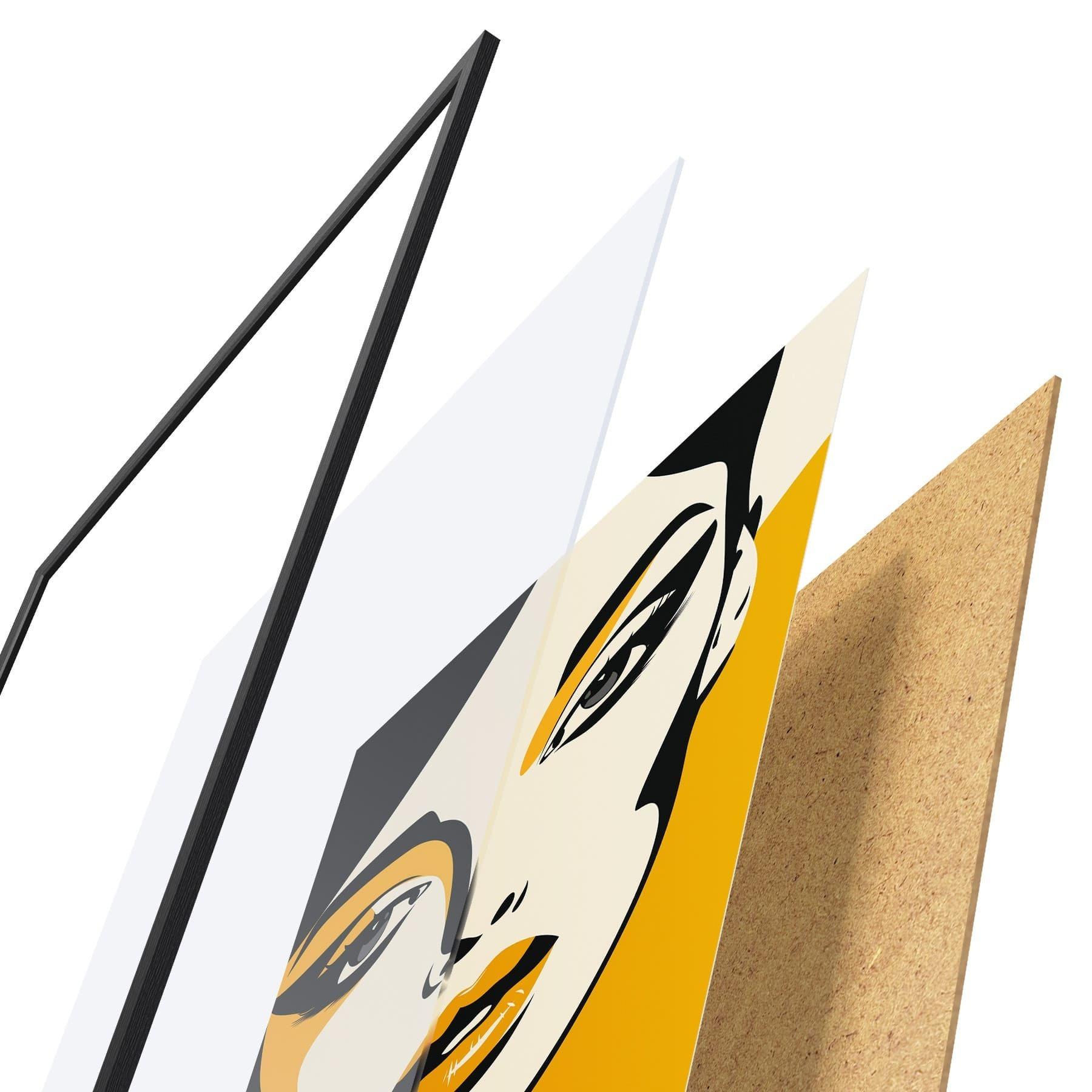 Plakat składa się z ramy, pleksi, wydrukowanego obrazu i podkładu z płyty wiórowej. Plakat można natychmiast zawiesić na ścianie dzięki uchwytom z tyłu.