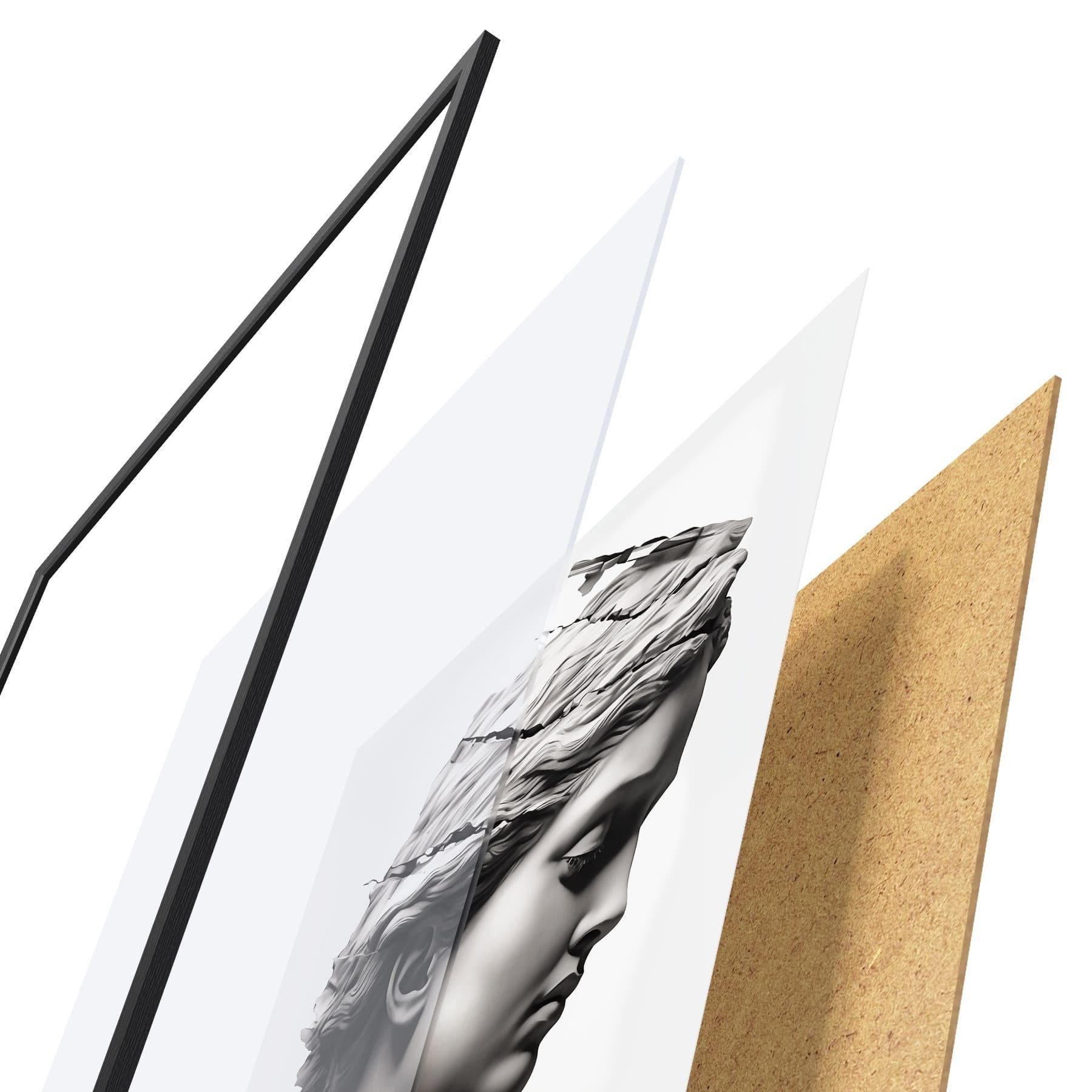 Plakat składa się z ramy, pleksi, wydrukowanego obrazu i podkładu z płyty wiórowej. Plakat można natychmiast zawiesić na ścianie dzięki uchwytom z tyłu.