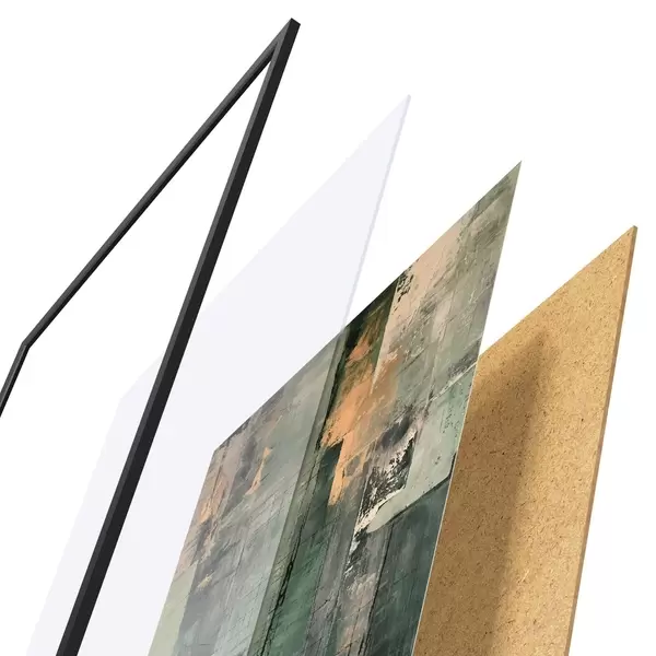 Plakat składa się z ramy, pleksi, wydrukowanego obrazu i podkładu z płyty wiórowej. Plakat można natychmiast zawiesić na ścianie dzięki uchwytom z tyłu.