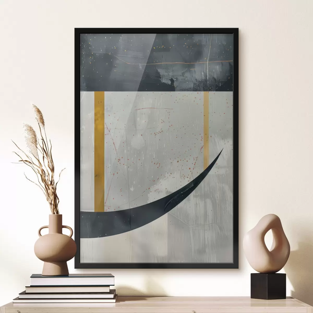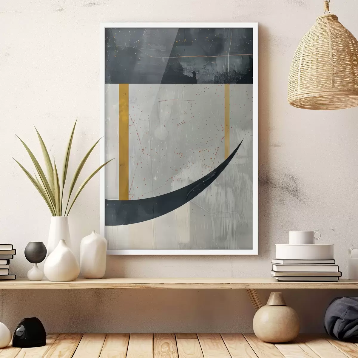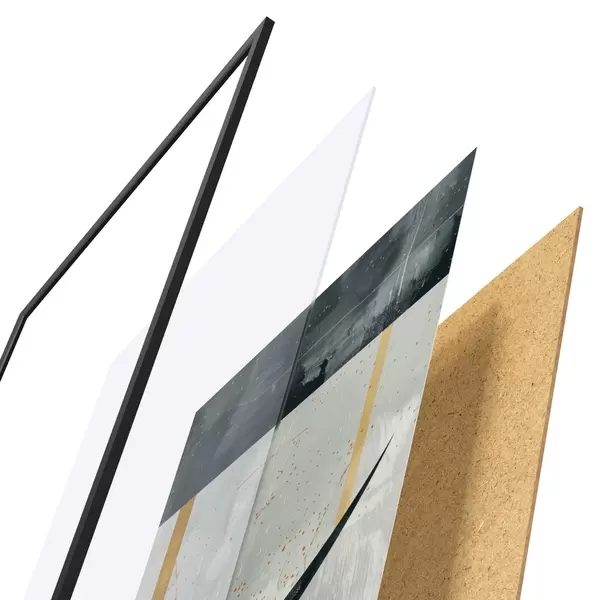 Plakat składa się z ramy, pleksi, wydrukowanego obrazu i podkładu z płyty wiórowej. Plakat można natychmiast zawiesić na ścianie dzięki uchwytom z tyłu.
