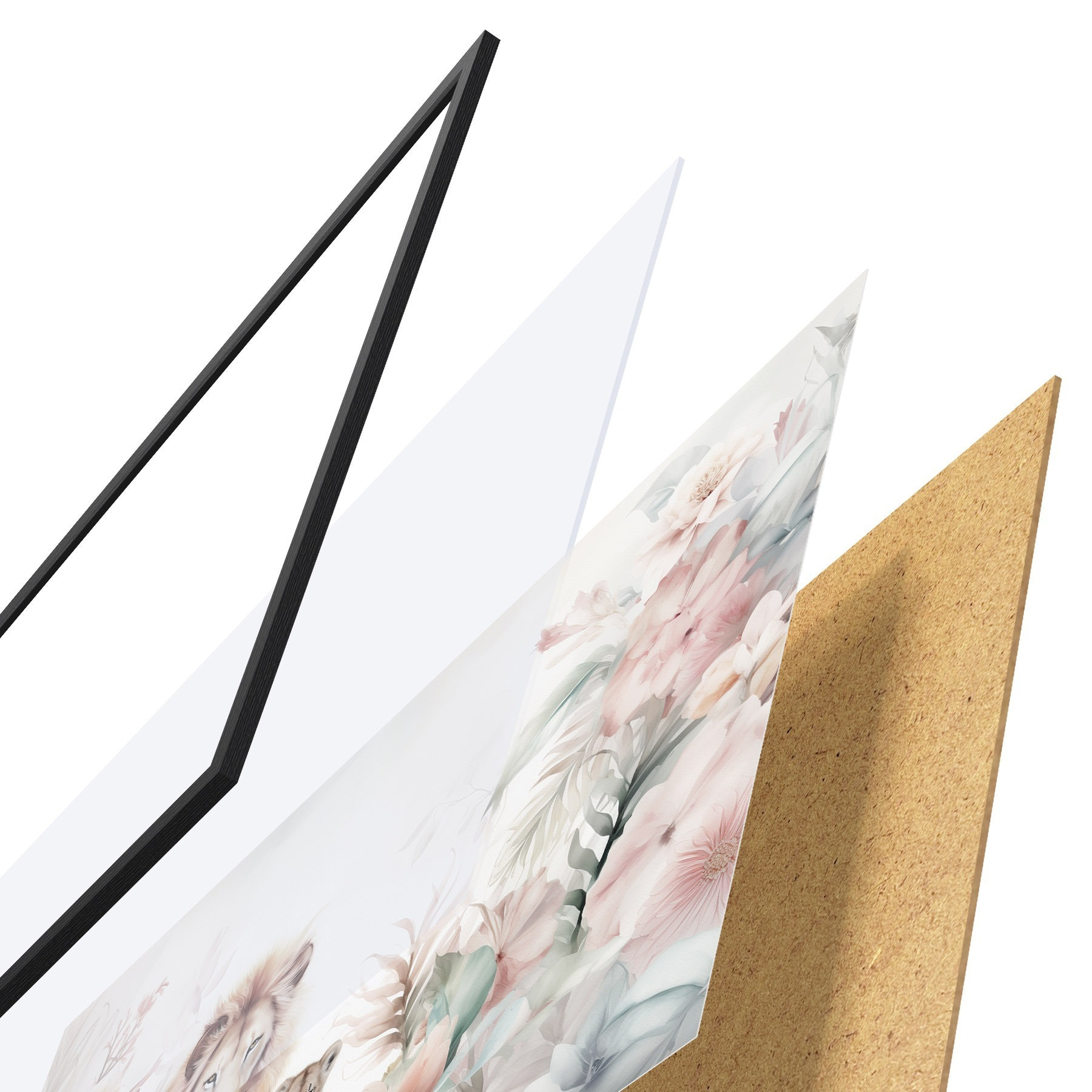Plakat składa się z ramy, pleksi, wydrukowanego obrazu i podkładu z płyty wiórowej. Plakat można natychmiast zawiesić na ścianie dzięki uchwytom z tyłu.