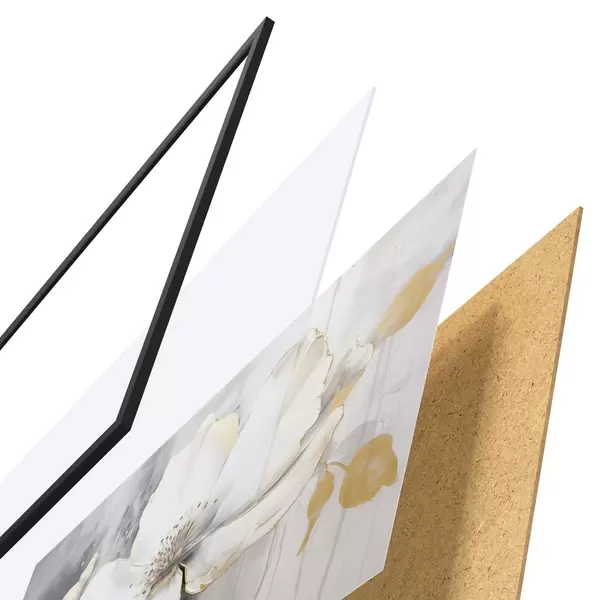 Plakat składa się z ramy, pleksi, wydrukowanego obrazu i podkładu z płyty wiórowej. Plakat można natychmiast zawiesić na ścianie dzięki uchwytom z tyłu.