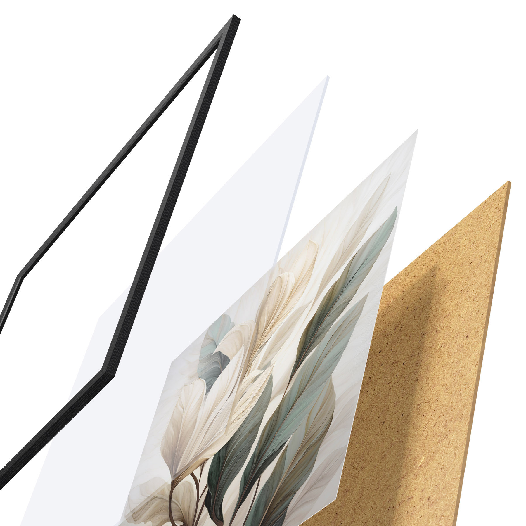 Plakat składa się z ramy, pleksi, wydrukowanego obrazu i podkładu z płyty wiórowej. Plakat można natychmiast zawiesić na ścianie dzięki uchwytom z tyłu.