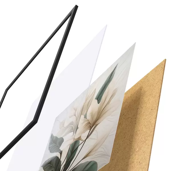 Plakat składa się z ramy, pleksi, wydrukowanego obrazu i podkładu z płyty wiórowej. Plakat można natychmiast zawiesić na ścianie dzięki uchwytom z tyłu.