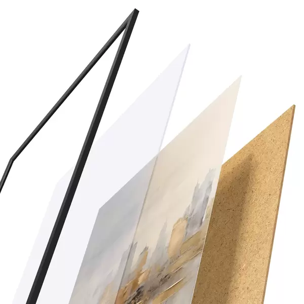 Plakat składa się z ramy, pleksi, wydrukowanego obrazu i podkładu z płyty wiórowej. Plakat można natychmiast zawiesić na ścianie dzięki uchwytom z tyłu.