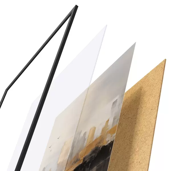 Plakat składa się z ramy, pleksi, wydrukowanego obrazu i podkładu z płyty wiórowej. Plakat można natychmiast zawiesić na ścianie dzięki uchwytom z tyłu.