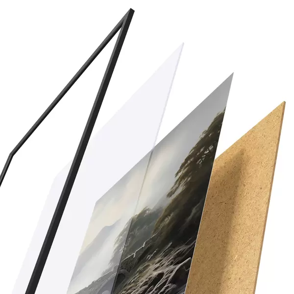 Plakat składa się z ramy, pleksi, wydrukowanego obrazu i podkładu z płyty wiórowej. Plakat można natychmiast zawiesić na ścianie dzięki uchwytom z tyłu.