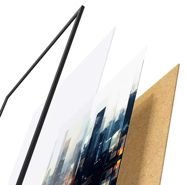 Plakat składa się z ramy, pleksi, wydrukowanego obrazu i podkładu z płyty wiórowej. Plakat można natychmiast zawiesić na ścianie dzięki uchwytom z tyłu.