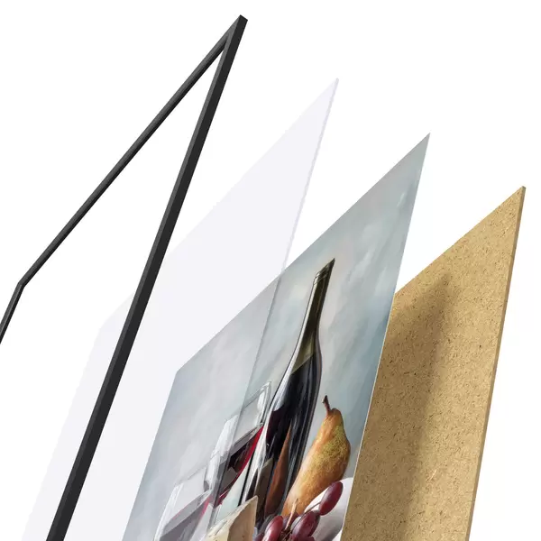 Plakat składa się z ramy, pleksi, wydrukowanego obrazu i podkładu z płyty wiórowej. Plakat można natychmiast zawiesić na ścianie dzięki uchwytom z tyłu.