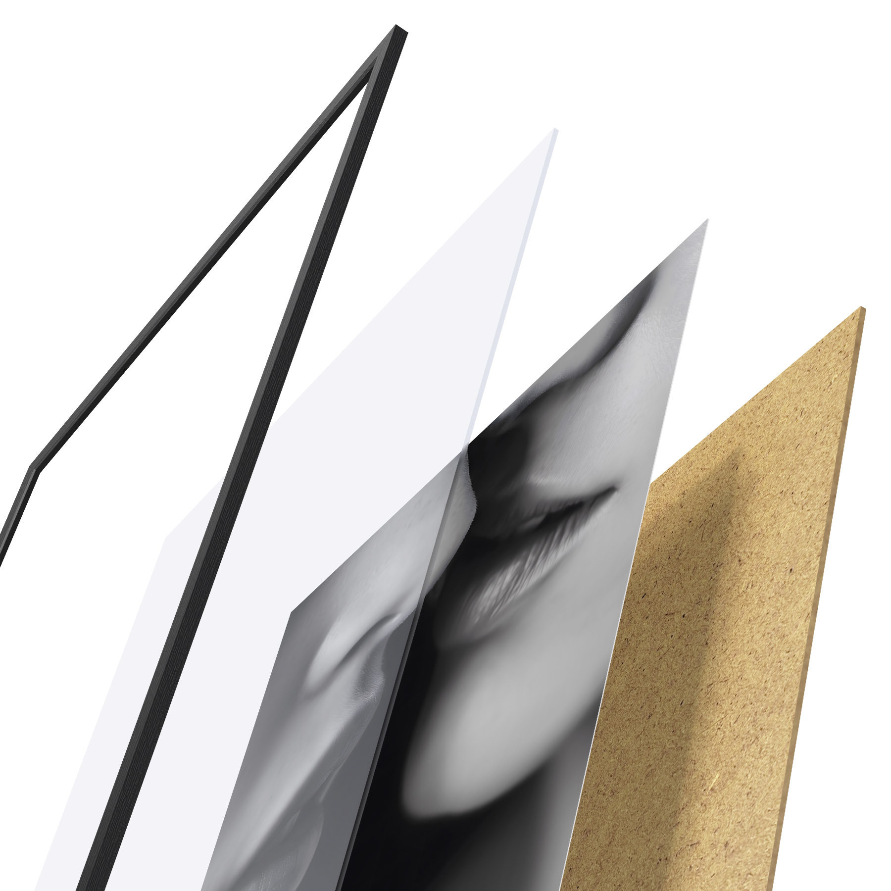 Plakat składa się z ramy, pleksi, wydrukowanego obrazu i podkładu z płyty wiórowej. Plakat można natychmiast zawiesić na ścianie dzięki uchwytom z tyłu.