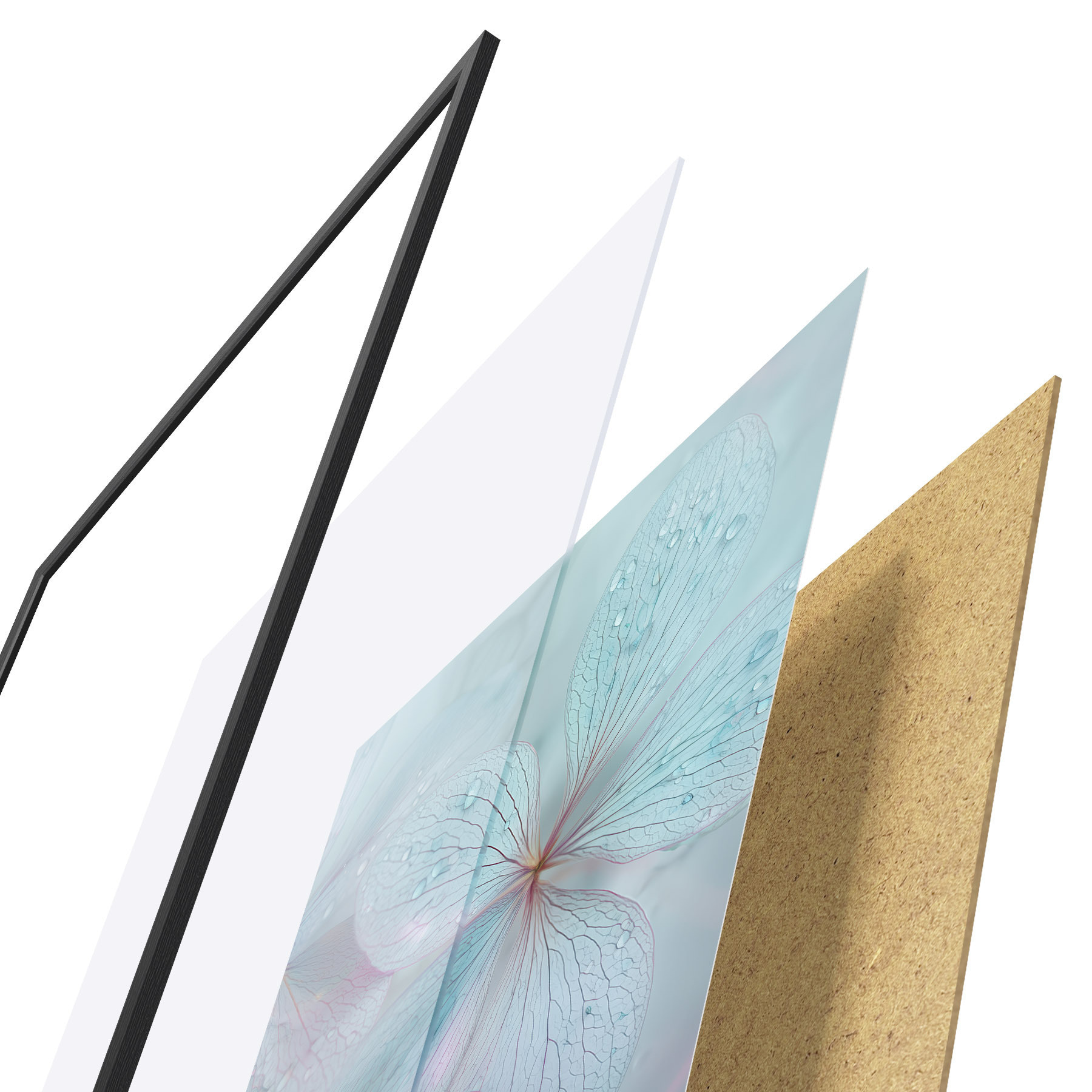 Plakat składa się z ramy, pleksi, wydrukowanego obrazu i podkładu z płyty wiórowej. Plakat można natychmiast zawiesić na ścianie dzięki uchwytom z tyłu.