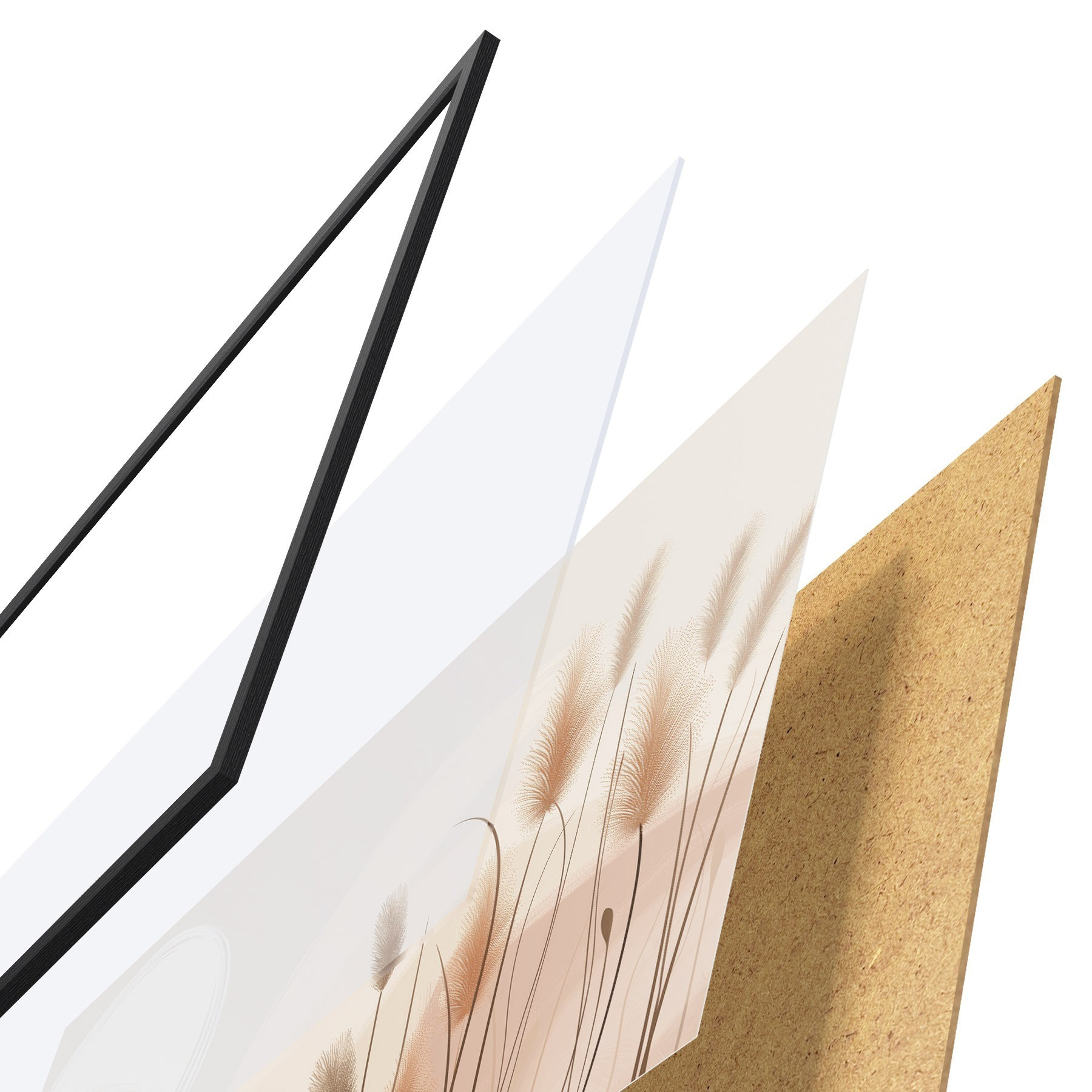 Plakat składa się z ramy, pleksi, wydrukowanego obrazu i podkładu z płyty wiórowej. Plakat można natychmiast zawiesić na ścianie dzięki uchwytom z tyłu.