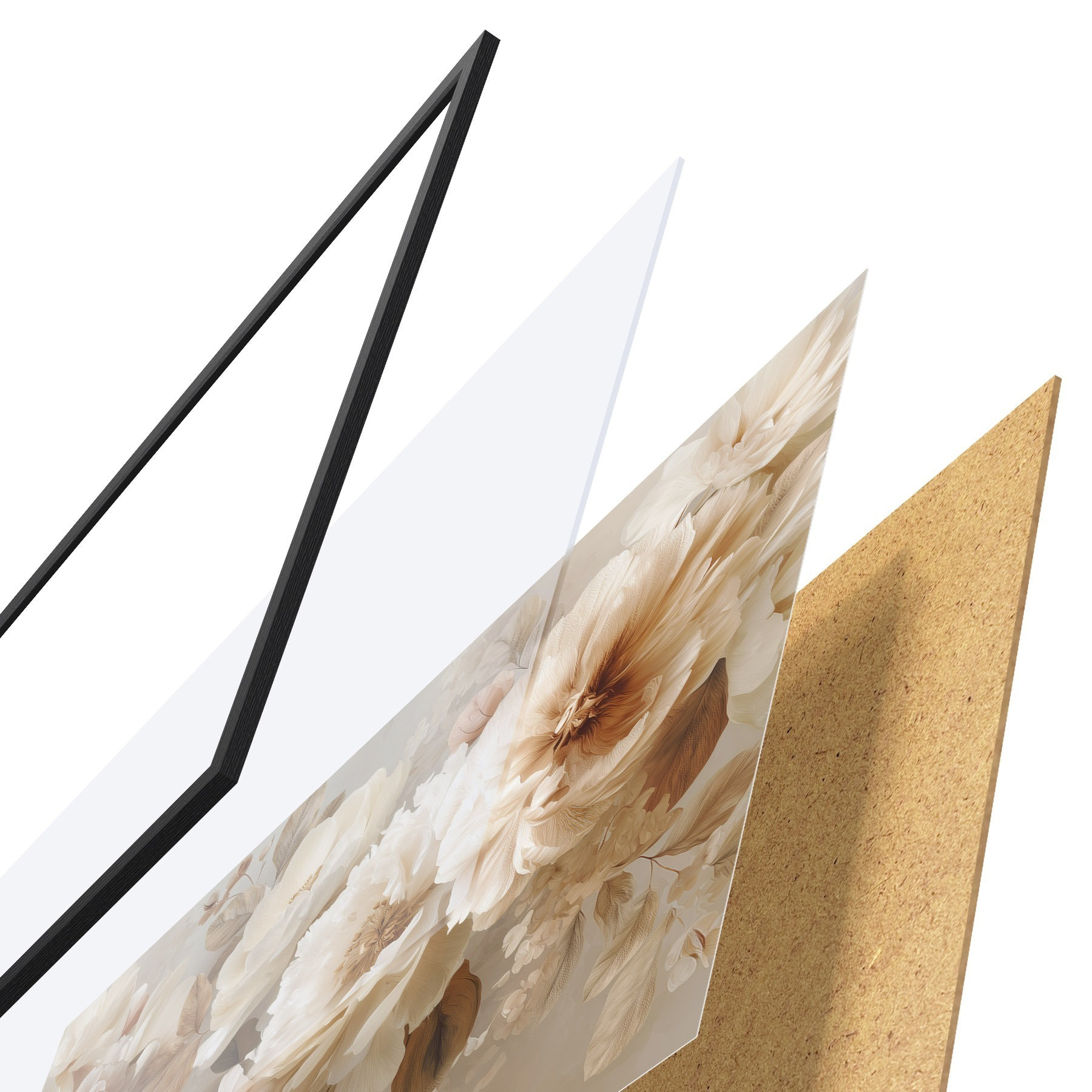 Plakat składa się z ramy, pleksi, wydrukowanego obrazu i podkładu z płyty wiórowej. Plakat można natychmiast zawiesić na ścianie dzięki uchwytom z tyłu.
