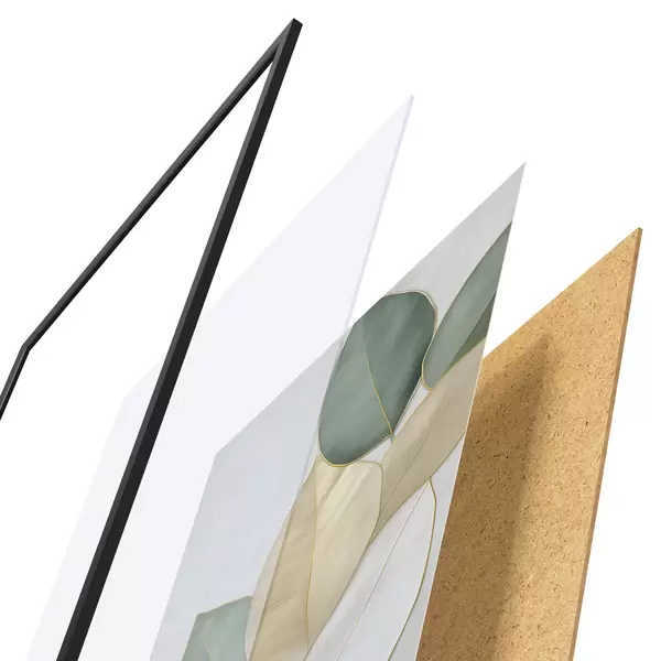 Plakat składa się z ramy, pleksi, wydrukowanego obrazu i podkładu z płyty wiórowej. Plakat można natychmiast zawiesić na ścianie dzięki uchwytom z tyłu.